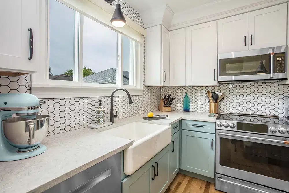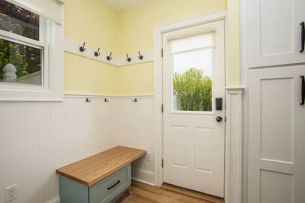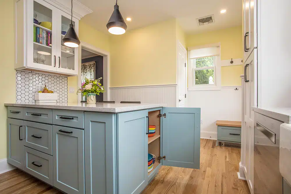 Reconfiguring access to basement let us create this beautiful kitchen with lots of storage, peninsula & entry seating and a much needed powder room