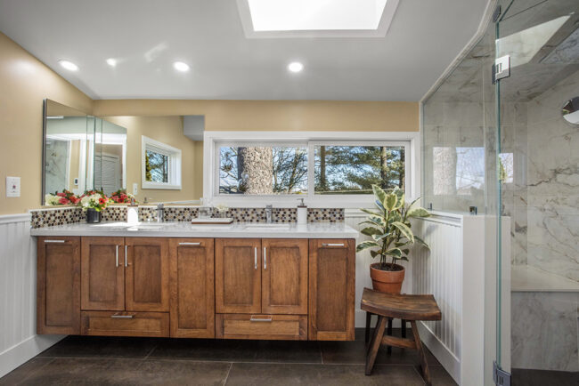 Expanded Spaces! Removing an in wall hamper allowed for deeper soaking tub with privacy for toilet and larger vanity. Taking space from an external shed expanded a powder room to a full bath with luxury shower Kitchen Portfolio