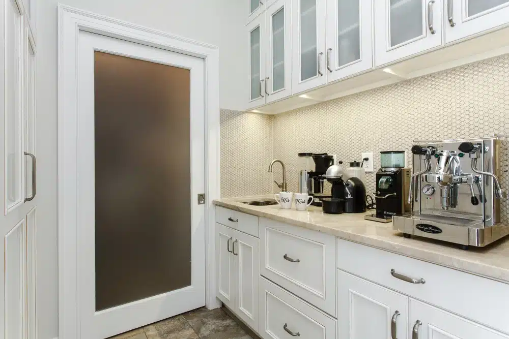 Wet bar and coffee station with assortment of coffee machines for every coffee aficionado.