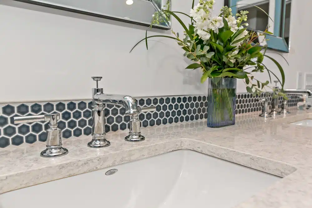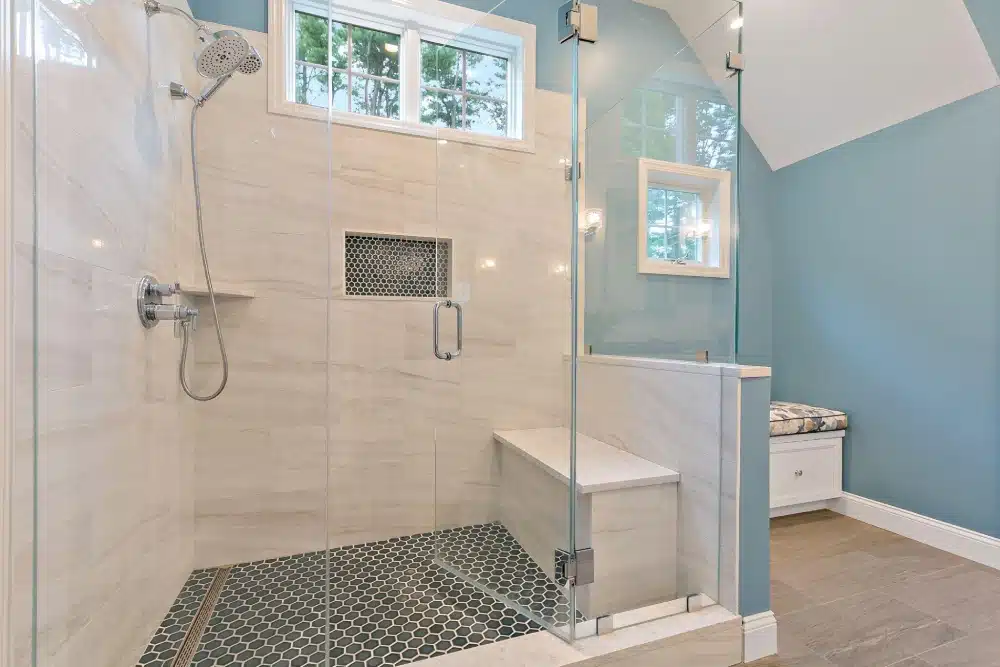 Blue hex mosaic & blue walls surround this custom vanity equipped with custom window seat and cushion.