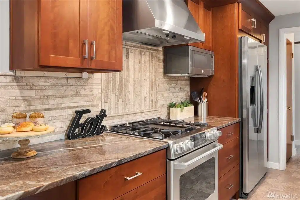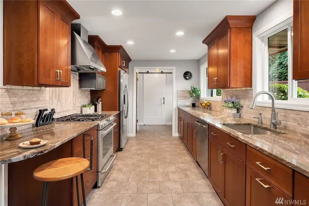 Gorgeous cherry shaker galley kitchen with entertaining space.