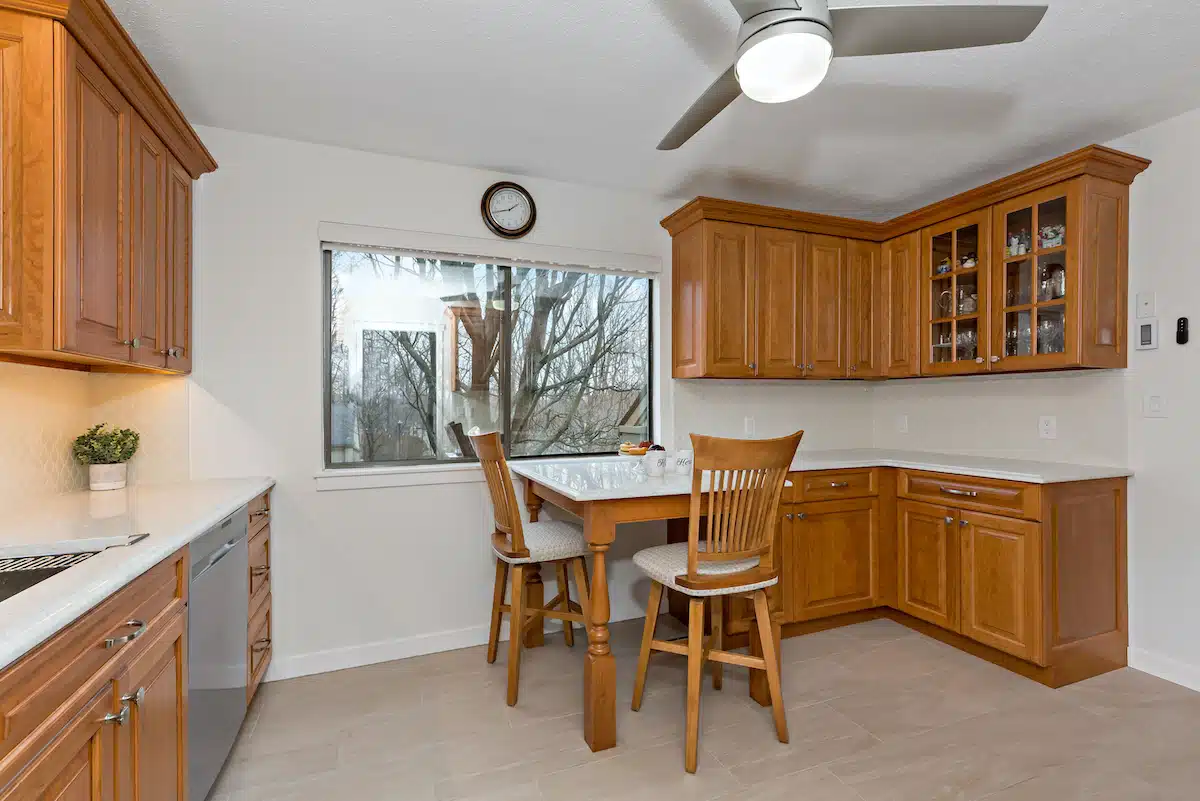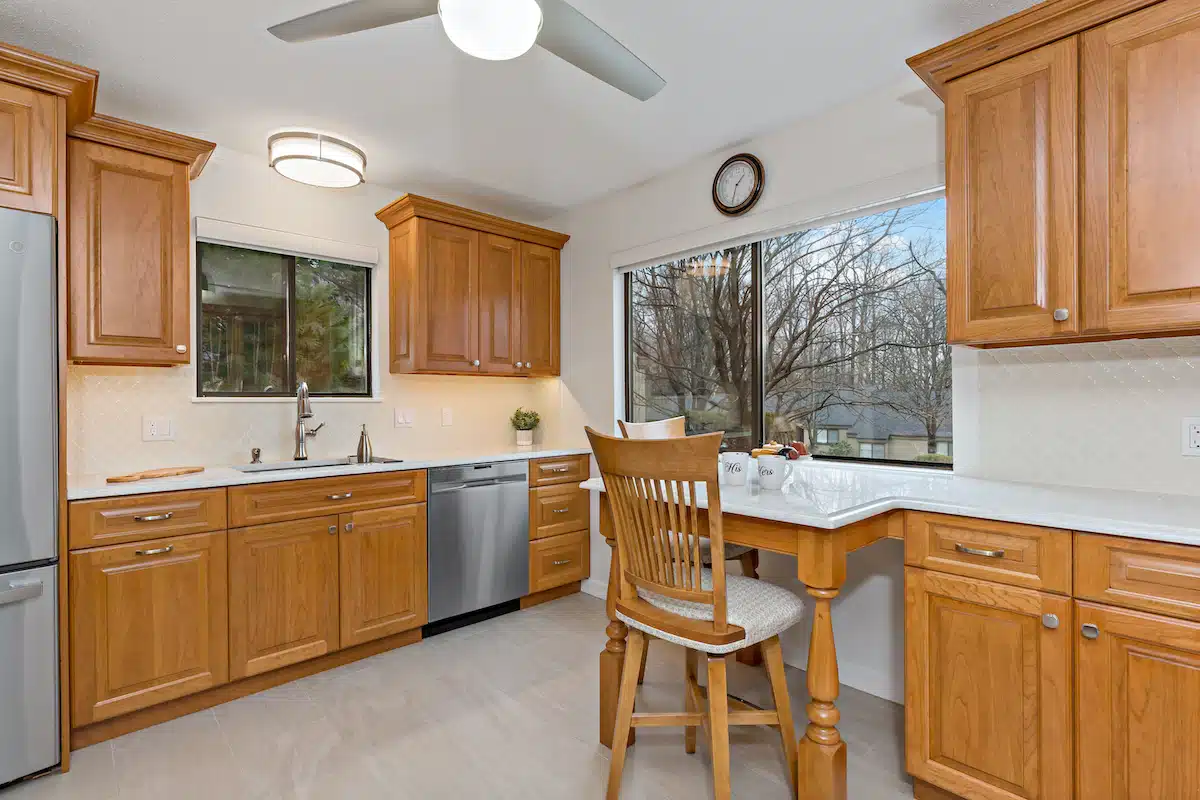 Custom cherry charmer with room for two! Custom cherry cabinets with bar seating for early morning rendez vous