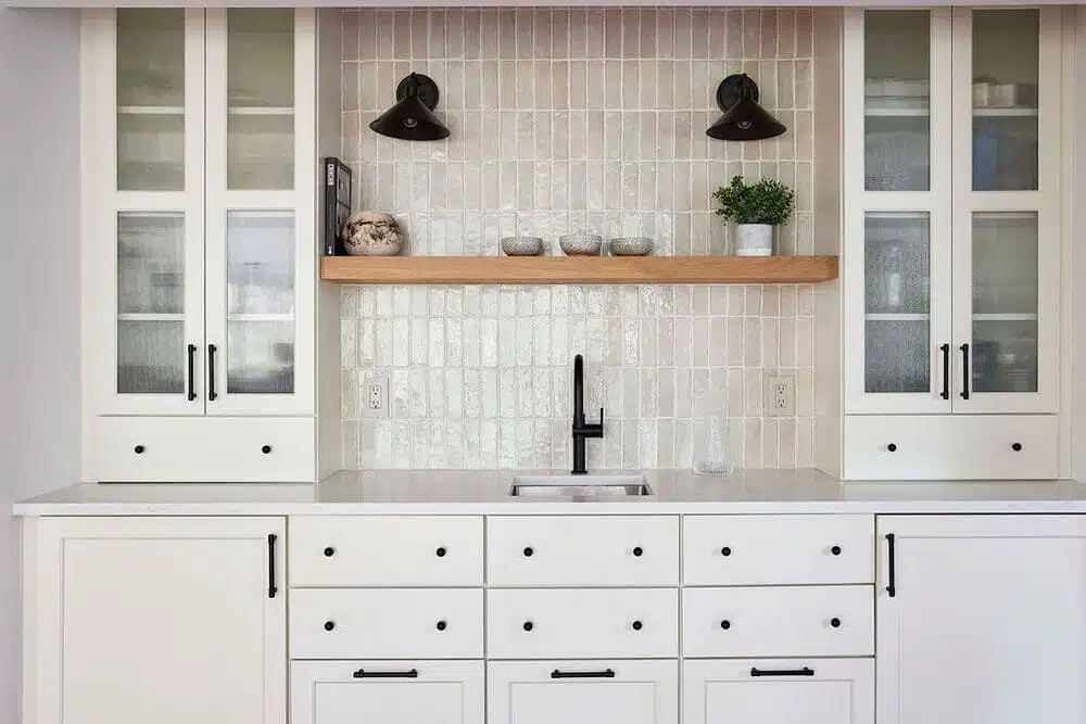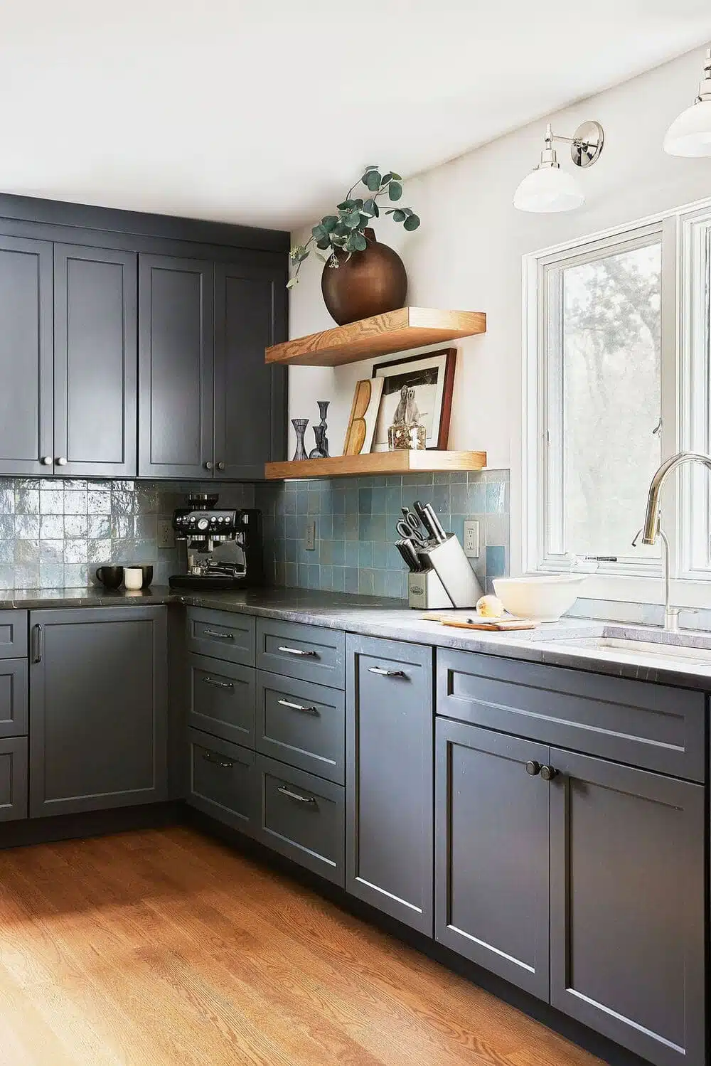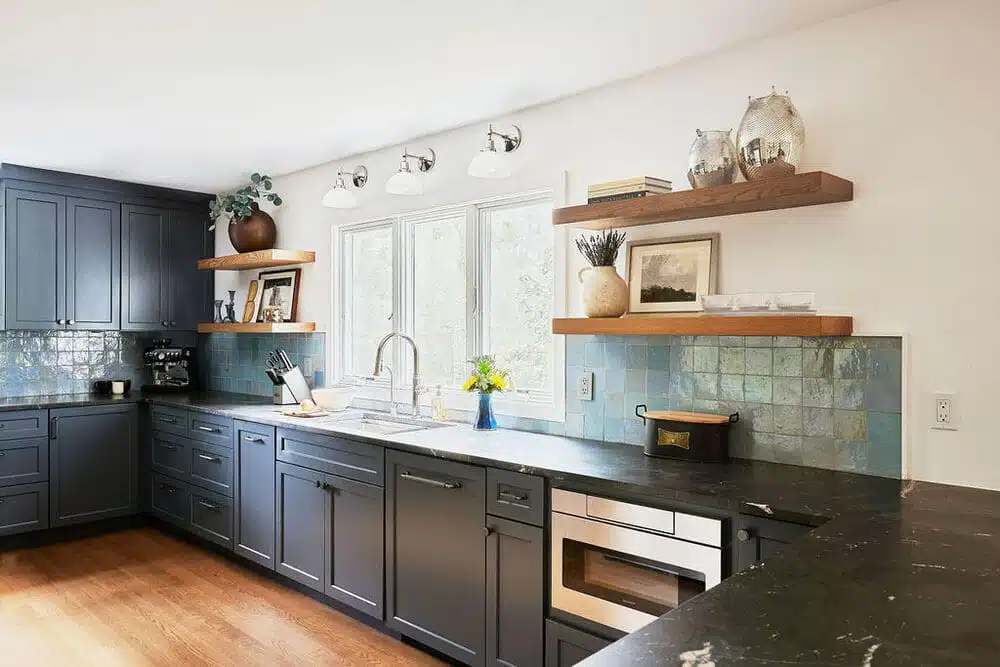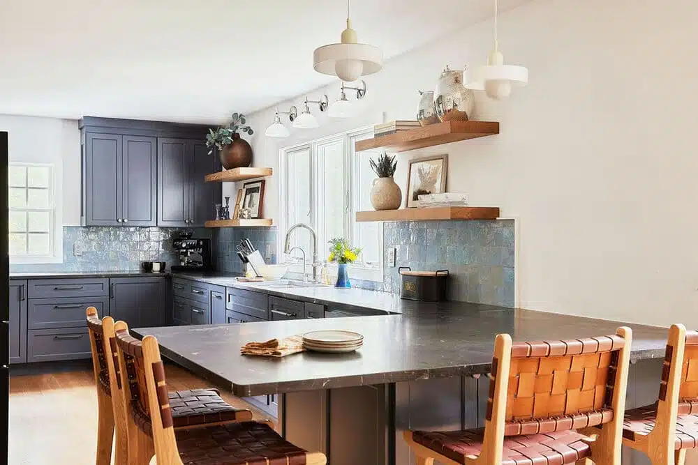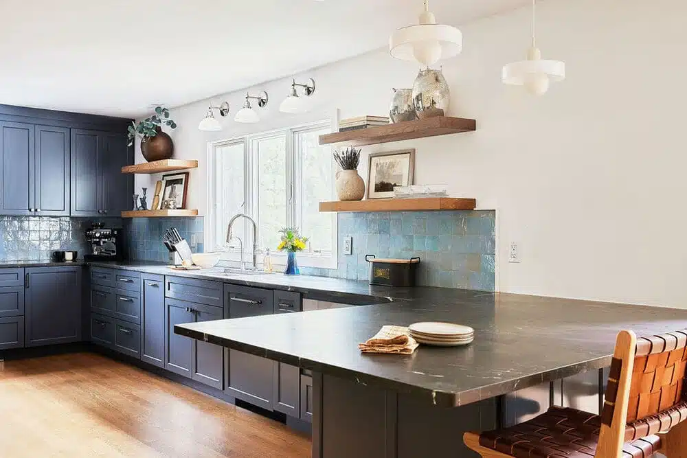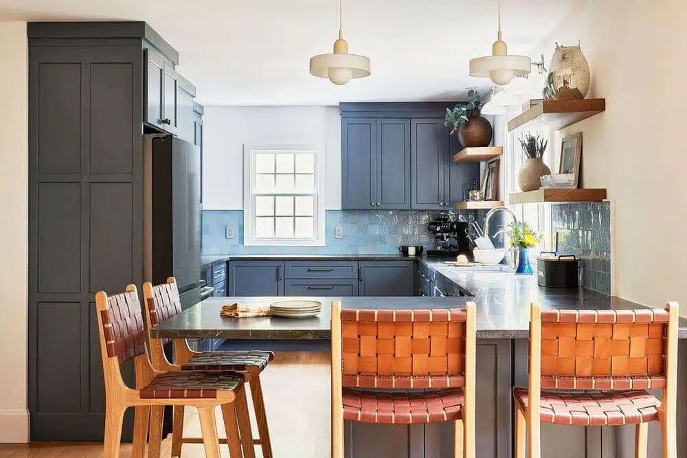 Moody Blue Kitchen with Swiss Coffee Wet Bar in Bedford NY